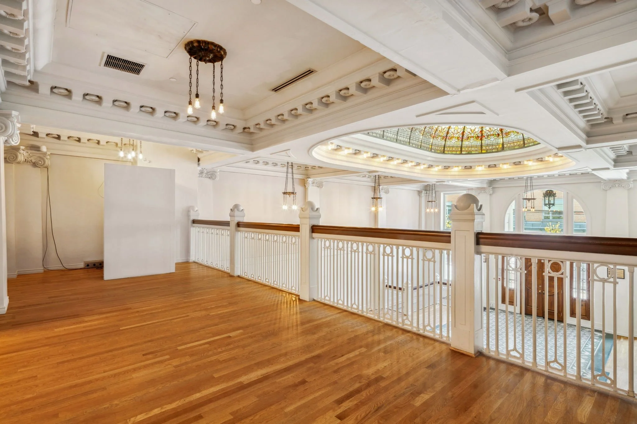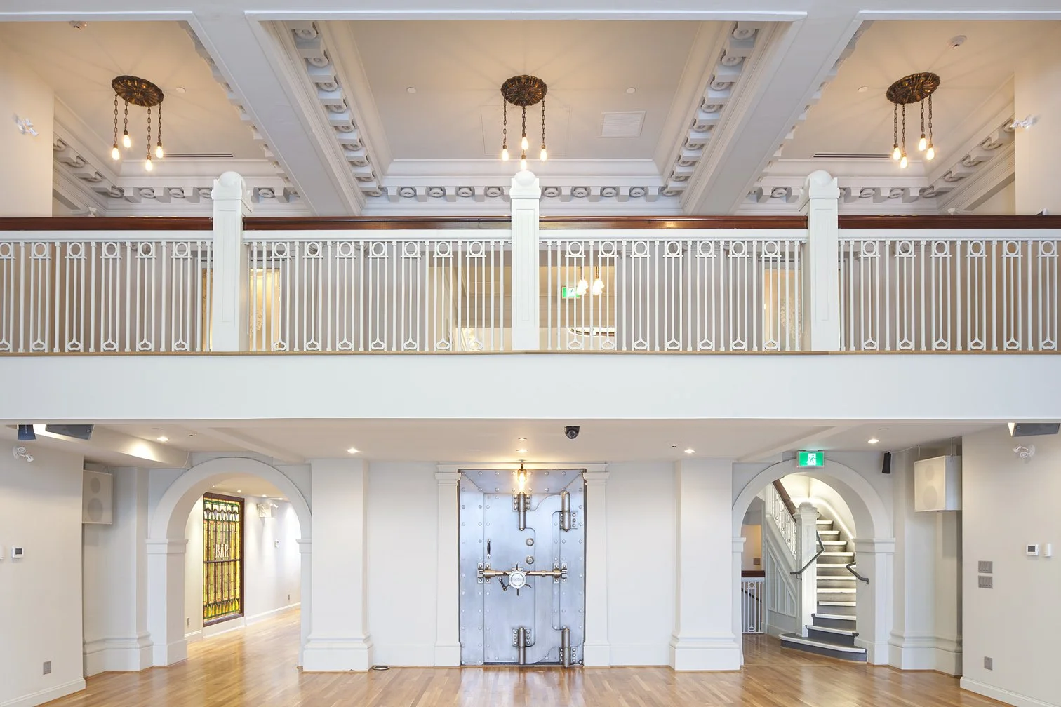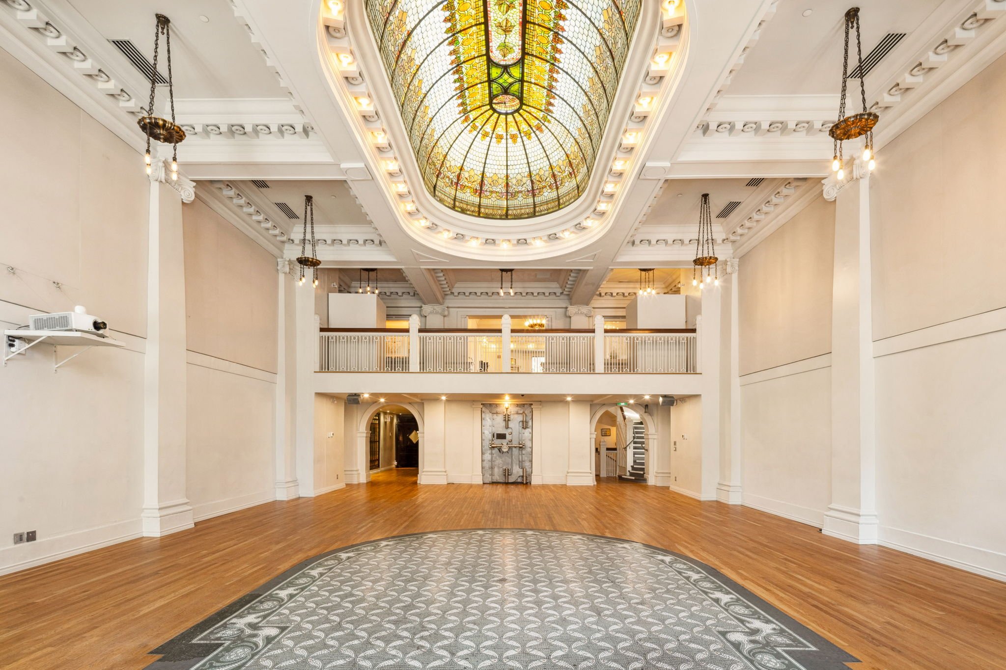 Step into the grand main hall and be welcomed by the original Bank of Canada vault door, set beneath a stunning stained-glass atrium. Neo-classical details are woven throughout the space, from intricate crown mouldings and handcrafted tile mosaics to bronze chandeliers that lend timeless elegance.